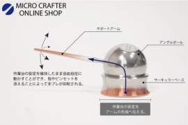 加えて手ぶれを抑制したまま自由な動作を行えるようにサポートアームを球状部材(アングルボール)に取付けて、ベース部材(サーキュラーベース)の上に載置することによって手指を支持しながら自由自在に作業することができます。