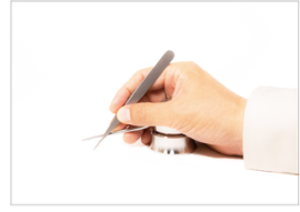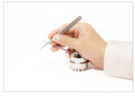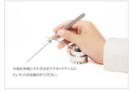 基本操作①と異なる点はピンセットをサポートアームに添えて操作します。 基本操作①の持ち方から中指を外側にスライドさせてピンセットをサポートアームに接触させます。 基本操作①に比べて、操作性の自由度は制限されますが、振れを限りなく抑えることができます。顕微鏡作業にも適した持ち方です。